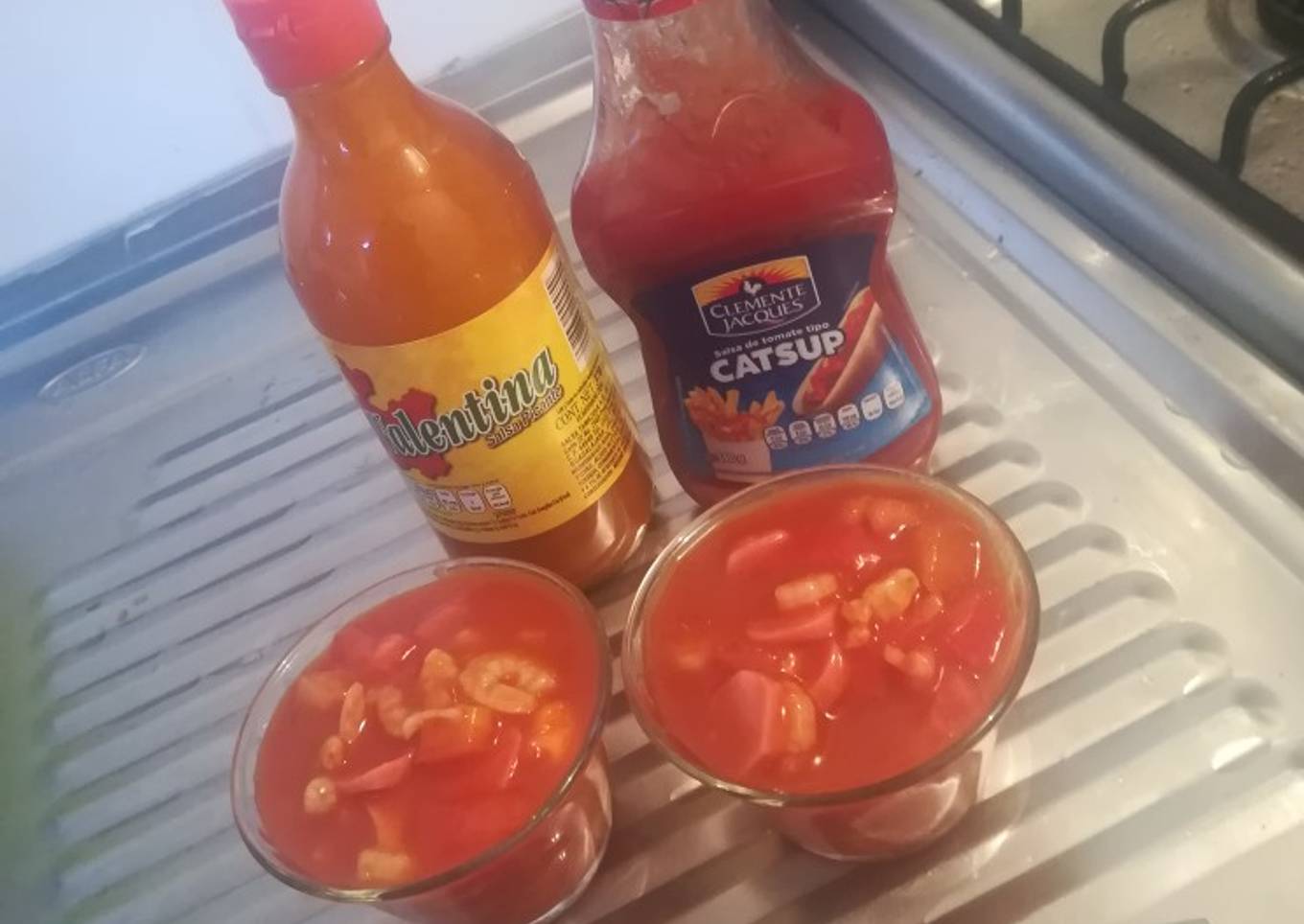 - Hervir los camarones por 10 minutos, después picar el jitomate junto con la cebolla y la salchicha y poner en un tazón, vaciar la taza de salsa catsup junto con la taza de salsa picante, por último agregar los camarones, mezclar y listo a Disfrutar!!!!!! Tip: puedes acompañarlo con tostadas o con galleta salada de las dos formas es exquisito!!!!