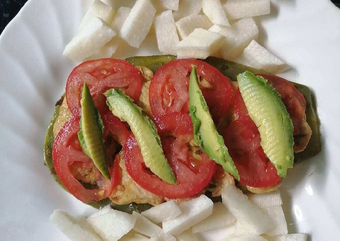 - En un plato como base colocar el nopal, arriba la milanesa, jitomate y aguacate. Acompañar con jícama picada o alguna otra ensalada y listo.