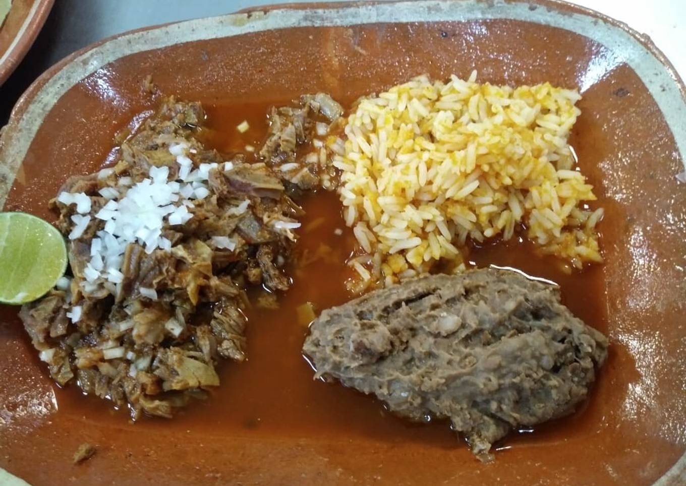 - Servir la birria con arroz rojo, frijoles refritos, cebolla picada y tortillas.