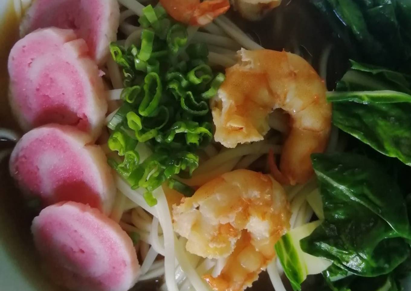 - Dejar enfriar para poder cortar el kamaboko, servir la sopa y poner como toppings el kamaboko por encima de la sopa con fideos, cebollín finamente picado, el camarón, y la acelga.